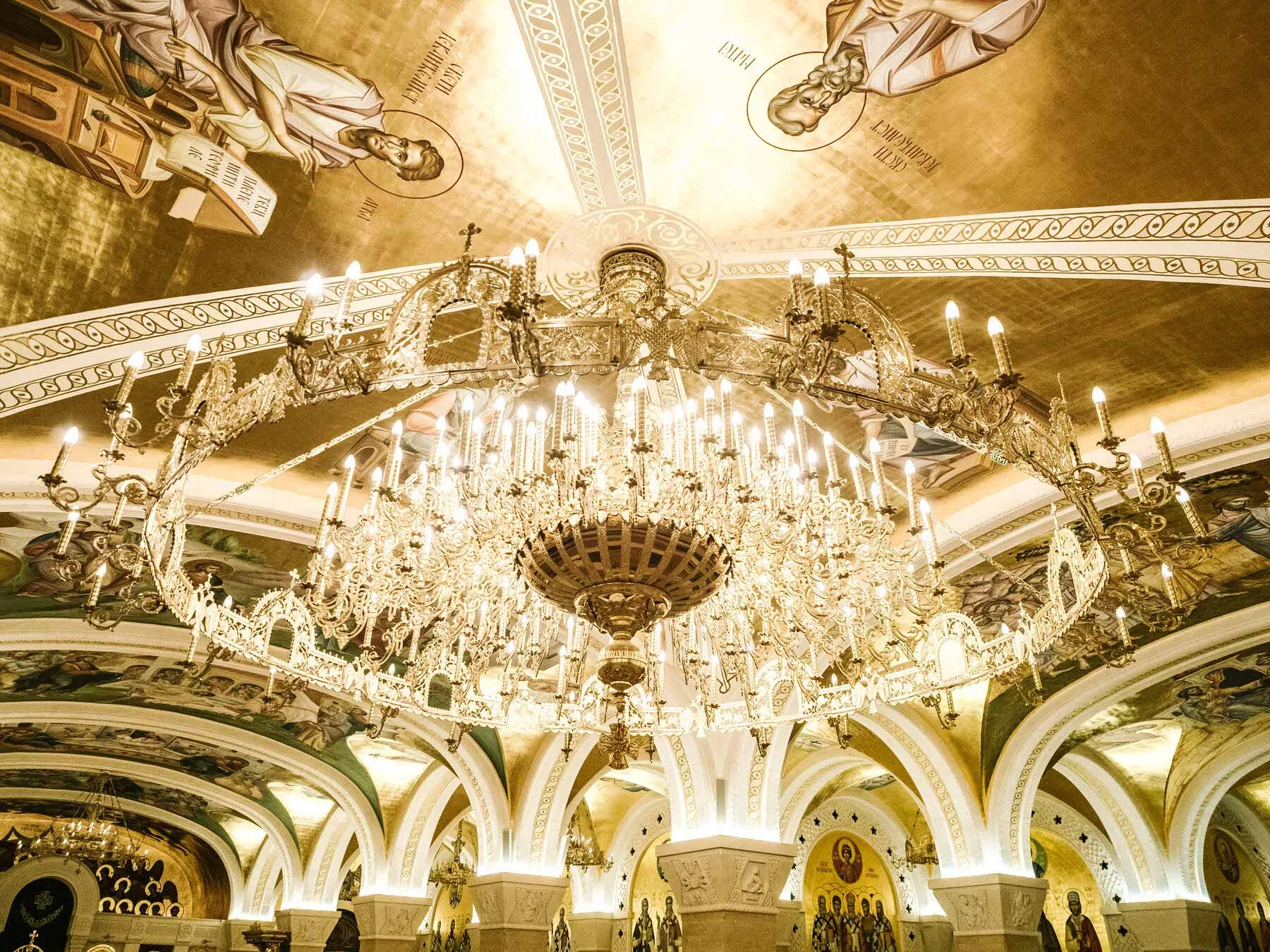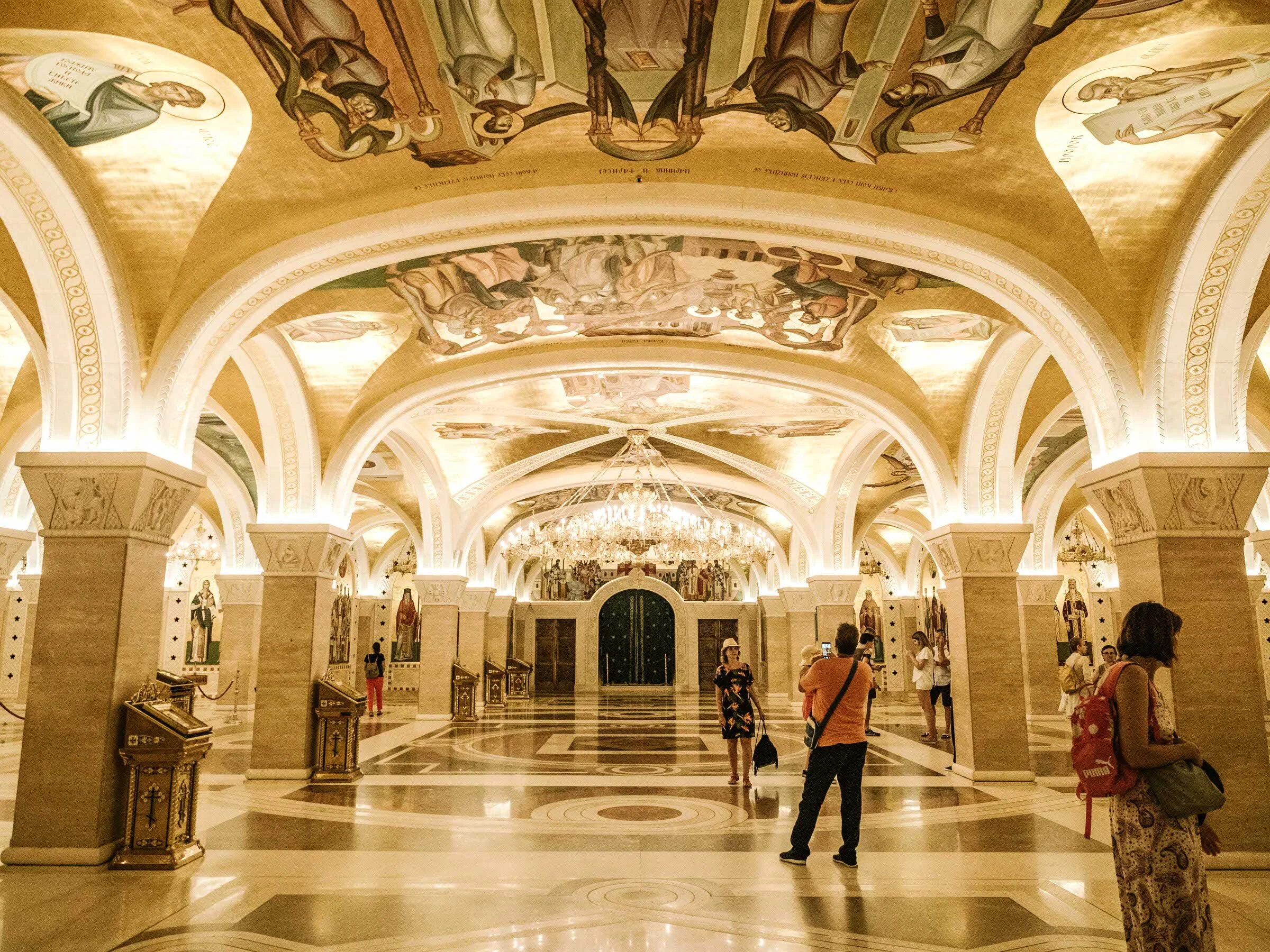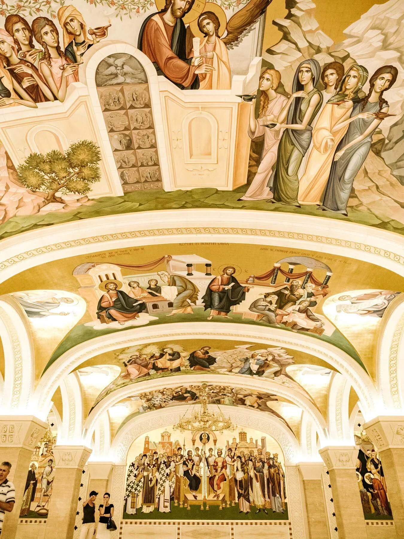 The Church of St. Sava’s central area was under construction when we visited, so we could only explore the basement. It serves as a temporary prayer hall and will act as a crypt for Serbian patriarchs in the future. But HOLY MOLY who knew a church basement could be so beautiful! (nothing like the old worn-down basement of the church we attended when I was a kid). Let's take a moment to appreciate the amount of gold in this room. The light reflected off the gold pillars, gold murals, and gold chandeliers. It almost felt like the room was on fire, glowing from within. The frescos on the walls were also predominantly designed in gold and feature images of martyrs, saints, and scenes from the Bible.